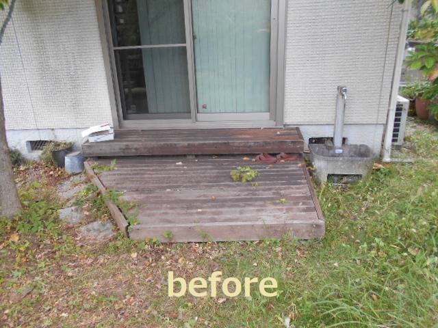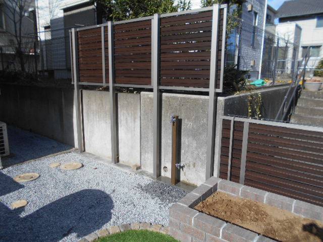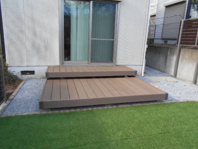 庭木はシンボルツリーだけ残し抜根撤去です。木製のウッドデッキは腐敗が進んでいました、こちらは樹脂製へと交換。垣根にはツタも絡んでいましたがアルミ製のフェンスへ。舗装は人工芝と砂利敷を行いました。隣家側に目隠しフェンス設置、立水栓移動、レンガで花壇を施工して完成です。