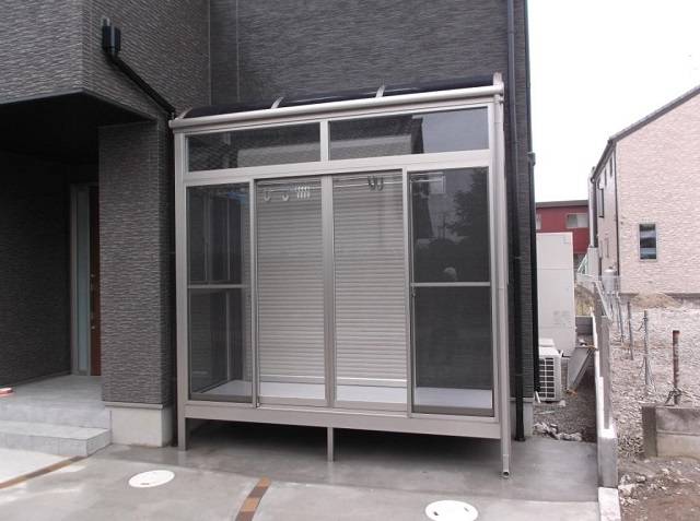 東側の掃き出し窓前にサンルーム、狭小スペースですが何とか納めました、洗濯物を干すのに重宝します。