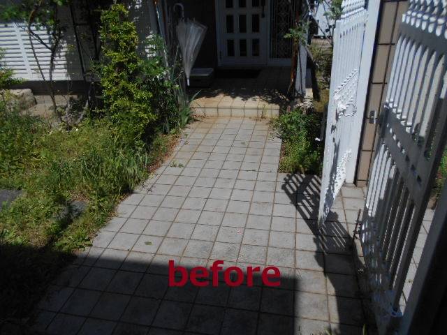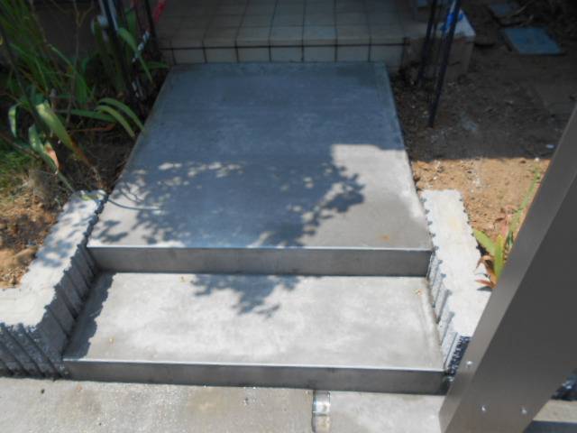 タイル門袖を開口幅解体し小口のタイルを補修、オーバードアを入口に施工、縦列型のカーポート設置しました。タイルアプローチだったところは高低差解消のため階段をシンプルなモルタル仕上げで施工し完成です。