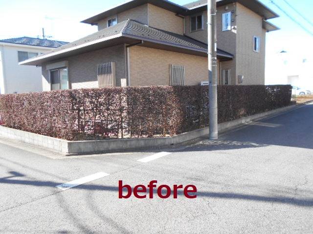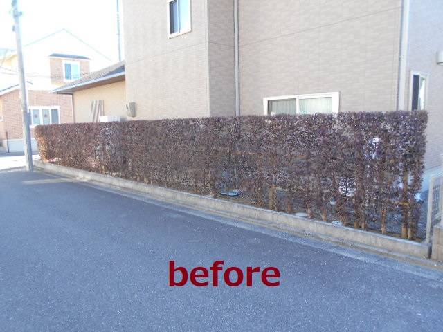 トキワマンサクの生垣からアルミ製フェンスへリフォーム工事です。
