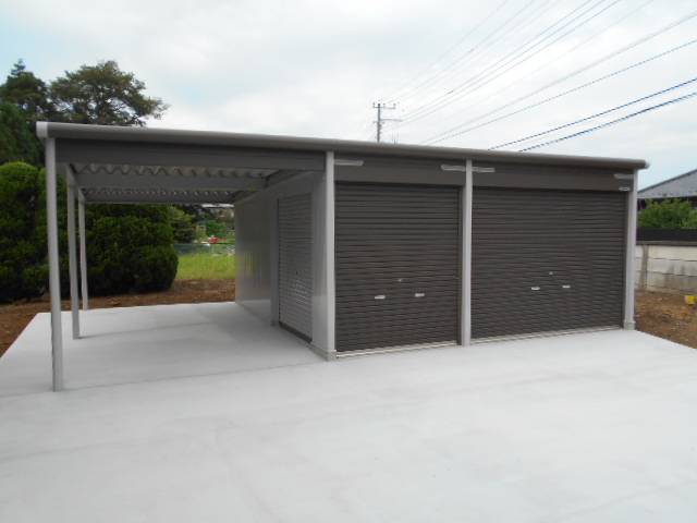 ヨドガレージラヴィージュになります、左側カーポートスペース、ガレージ内は倉庫スペース、車庫スペースと区分けしてあります。側面から出入りできるシャッターをつけ内部コンセントまで設置して完成です。