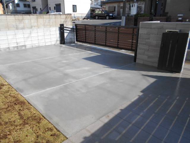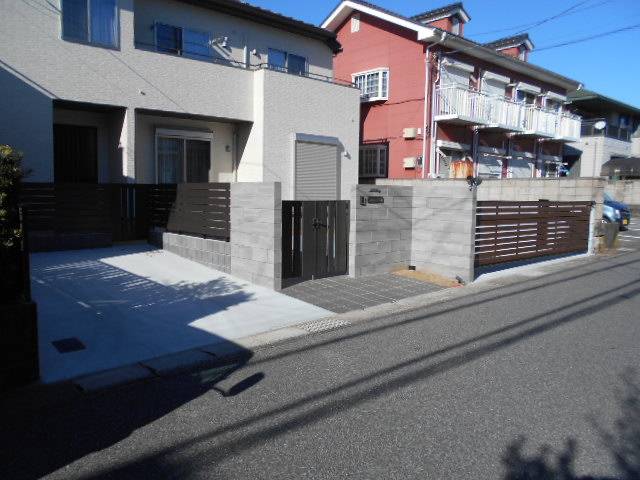 中央に門柱、左側は1台分駐車スペースと奥に片開き門扉、右側は2台分の駐車スペースになります。
