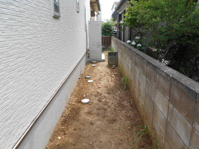 アプローチタイルは玄関ポーチまで施工です、庭には天然芝を植えました。